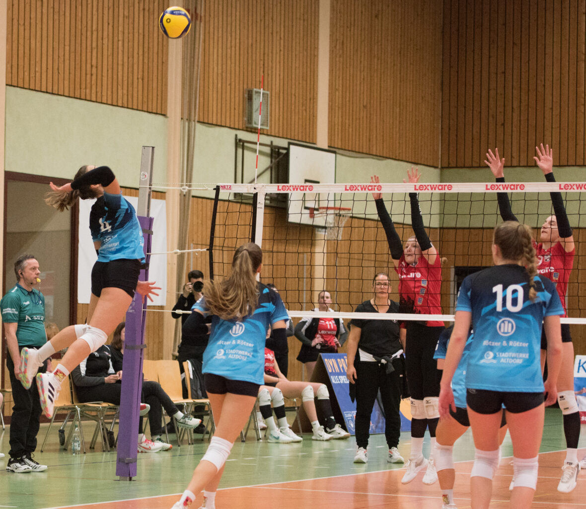 Im Auf­tak­t­satz liefen die TV-Löwin­nen mit Zus­pielerin Anna Wag­n­er auf, die ihre Angreiferin­nen geschickt in Szene set­zen kon­nte. Gle­ich zu Beginn sorgte TV-Mit­tel­block­er­in­Mag­dale­na Wil­helm dafür, dass Son­thofen durch ihreKurzdis­tan­za­uf­schläge direkt hin­ters Netz Annah­meprob­leme hat­te. Eine frühe 4:0 Führung für den TV sorgte für Sicher­heit. Die bei­den TV-Lib­eras übten sich im Job­shar­ing. Amelie Fuchs bei eigen­em Auf­schlag, eher mit Abwehrauf­gaben. Han­nah Sub­ke im Annah­meriegel. Alt­dorfs Angreiferin­nen Nad­ja Nawrat (spätere MVP) und Simona Dammer bracht­en ihre Schläge durch, bis Son­thofen ent­nervt ins Aus schlug oder der Ball doch im All­gäuer Ter­rain lan­dete. Mit 25:14 endete der Satz ohne große Gegenwehr.