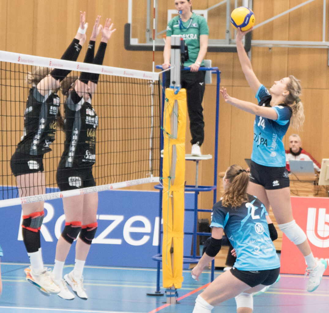 Wer jedoch glaubte, die Altdorferinnen würden sich davon einschüchtern lassen, sah sich im zweiten Satz eines Besseren belehrt. Mit deutlich mehr Energie und Selbstbewusstsein startete das Team in den Durchgang. Altdorf trug seine Angriffe nun konsequent vor und steigerte sich insbesondere in der Abwehr und Annahme. Durchgang zwei sicherten sich die Gäste schließlich mit 25:21. Im dritten Satz konnte die Gäste allerdings nicht an die Leistung aus Satz zwei anknüpfen. Vor allem die Wiesbadener Angriffe über die Mitte bereiteten der Altdorfer Defensive große Probleme. Trotz einer beherzten Aufholjagd am Ende des Satzes gelang es Altdorf nicht mehr, den Rückstand wettzumachen, Satz drei ging mit 25:21 an den VCW.