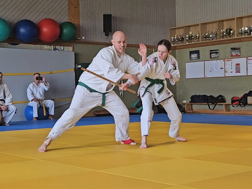 Der Prü­fungsablauf ver­lief ins­ge­samt sehr pos­i­tiv: pünk­tlich ges­tartet und konzen­tri­ert durchge­zo­gen zeigten die Prüflinge viele saubere und sou­veräne Leis­tun­gen, zugle­ich gab es auch kleine Schwach­stellen, vor allem in der Bewe­gungslehre sowie bei Gegen‑ und Weit­er­führung­stech­niken, die noch klar­er und flüs­siger wer­den dür­fen; ger­ade diese Punk­te wollen wir im Train­ing gezielt ange­hen. Dank der starken Präsen­ta­tion in den übri­gen Prü­fungs­fäch­ern — saubere Aus­führung, Ruhe und Selb­stver­trauen — kon­nten diese Lück­en jedoch gut aus­geglichen wer­den, sodass am Ende alle die neue Graduierung völ­lig ver­di­ent erhiel­ten. Her­zlichen Glück­wun­sch an Sask­ia, Thea, Johan­na, Peter und Patrick.
