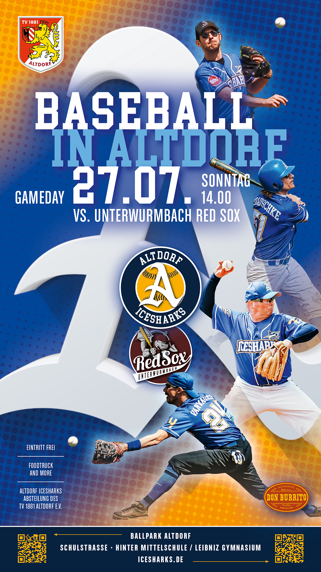 Am Son­ntag, den 27. Juli ab 14.00 Uhr emp­fan­gen die Alt­dorf Ice­sharks die Red Sox aus Unter­wurm­bach. In der Lan­desklasse Base­ball Nord wer­den Sin­glegames über 7 Innings  (oder mit max­i­malem Zeitlim­it von 2,5 Stun­den) gespielt.