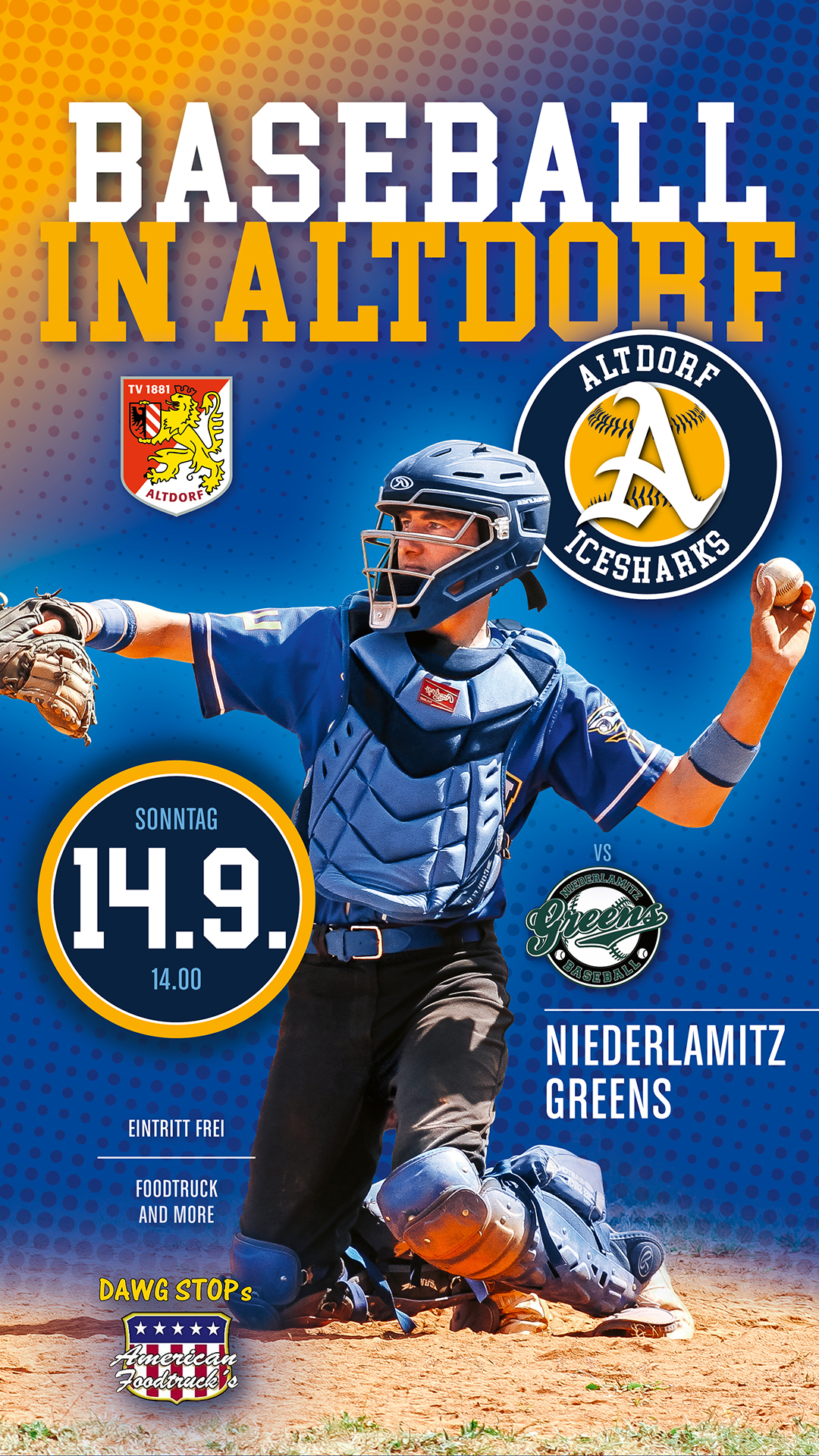 Wer also Lust auf Baseball hat oder einfach mal kennenlernen will, sollte unbedingt am Sonntag, den 14. September ab 14.00 Uhr in Altdorf am Start sein. Es gibt lecker American Style Hot Dogs und mehr vom Foodtruck DAWG STOP, Moderation und mehr. Eintritt frei.