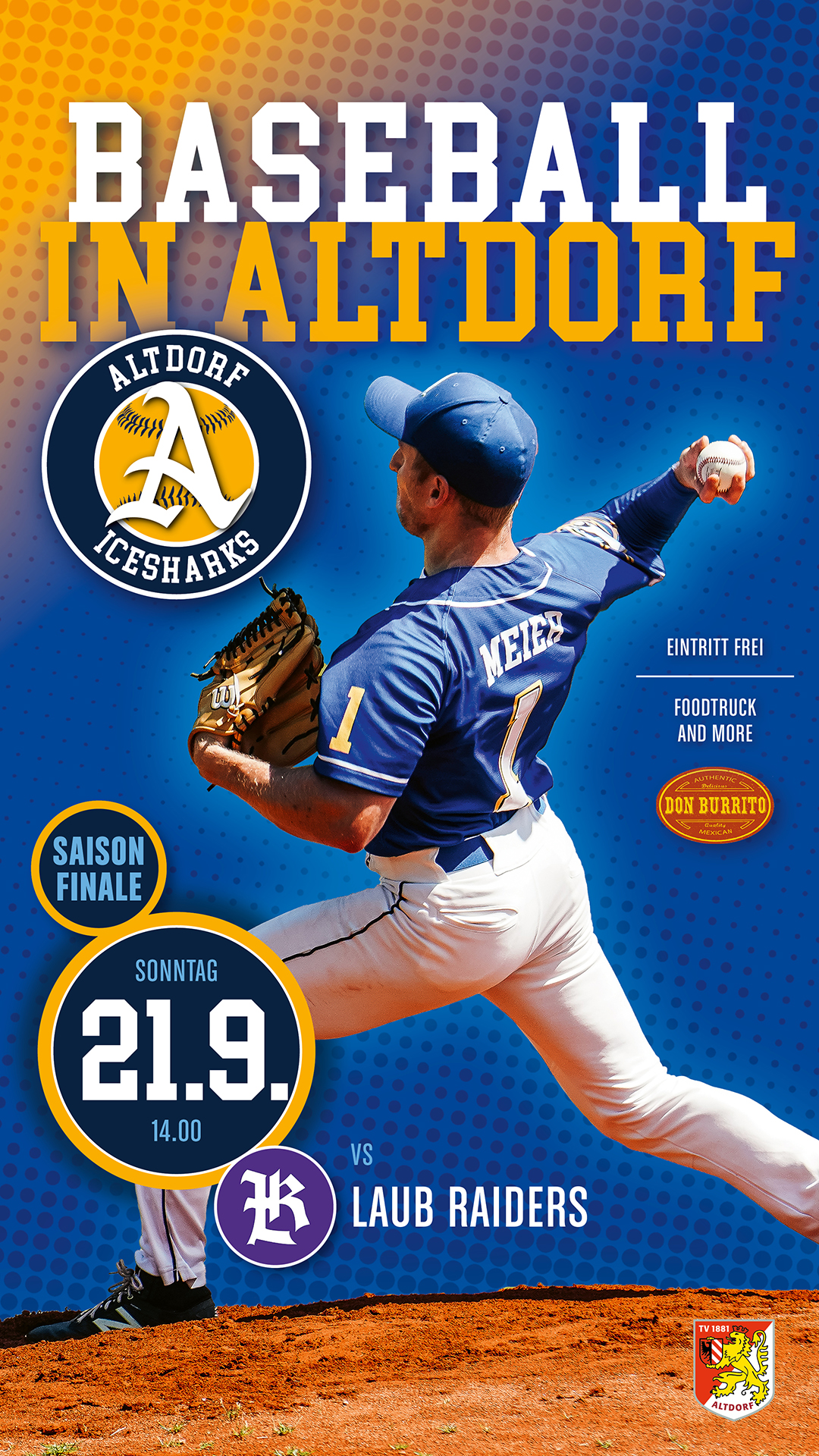 Wer also Lust auf Baseball hat oder einfach mal kennenlernen will, sollte unbedingt am Sonntag, den 21. September in Altdorf am Start sein. Es gibt lecker Burritos und mehr vom Foodtruck Don Burrito, Moderation und mehr. Eintritt frei.