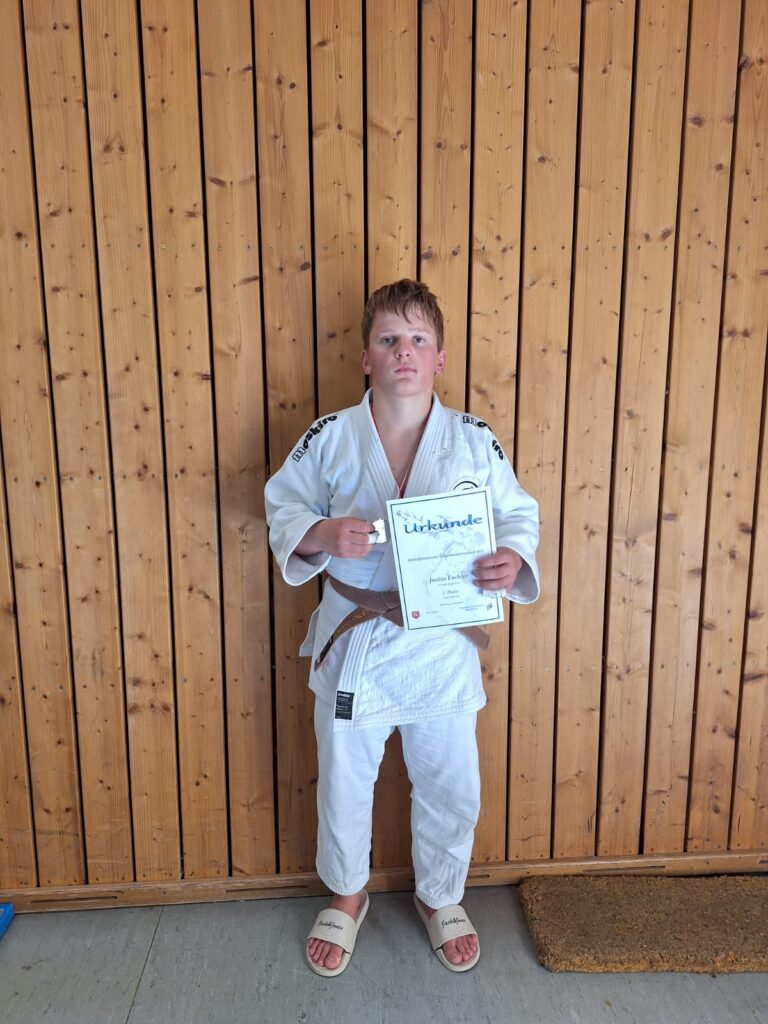 Qual­i­fika­tion zur Nord­bay­erischen EM in Hof war das erk­lärte M U S S, unter die sechs besten zu kom­men. Das ist aber kein Anspruch für Jus­tus. Im let­zten Jahr der U15 ist das erk­lärte Ziel auf jeden­fall eine gute Platzierung bei den  Süd­deutschen Meis­ter­schaften zu erre­ichen. Aber im Schw­ergewicht plus 66 kg kön­nen die Geg­n­er unter Umstän­den einiges mehr auf die Waage brin­gen und von daher wird der Weg dor­thin nicht ganz ein­fach wer­den. Bei den Mit­tel­fränkischen EM hat­te er nicht allzu viel Mühe bis ins Finale vorzu­drin­gen, bis dahin erledigte er die drei Kämpfe sou­verän. Ja und dann ver­schenk­te er den möglichen ersten Platz. Eine klare Waza-ari Führung gab er leichtsin­niger­weise her, weil er das gemacht hat was er nicht tun sollte und das weiß er jet­zt. Einen so großen Vor­sprung muss man ein­fach über die Zeit brin­gen, aber das wird er noch ler­nen müssen.
