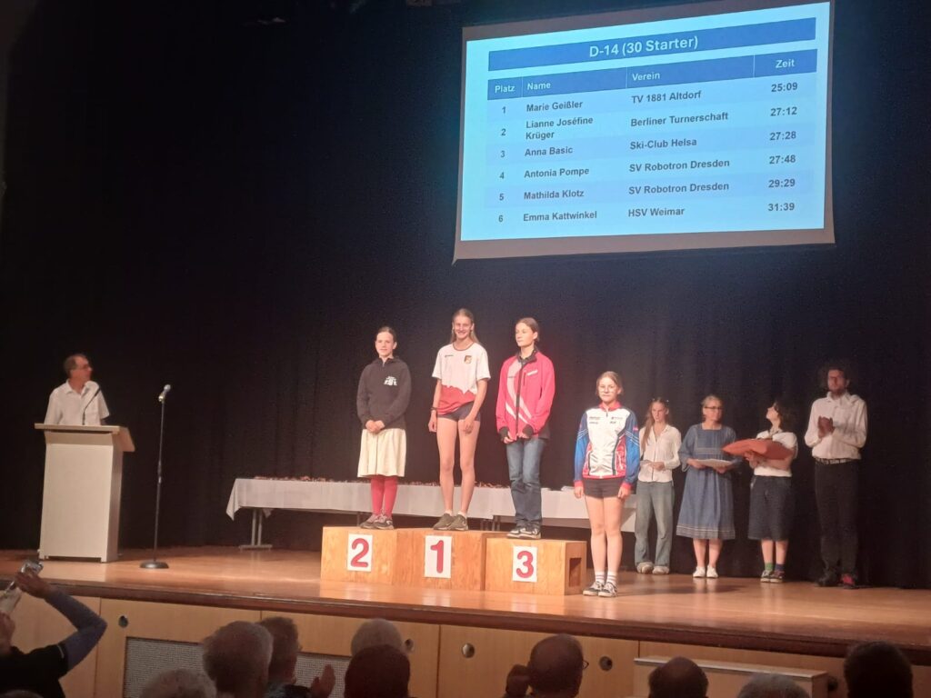 Marie gelang in der Klasse D‑14 ein fast fehlerfreier Lauf bei hohem Tempo, so dass sie die ca. 3,1 km lange Strecke mit 2 min Vorsprung gewann und überglücklich über diesen großen Erfolg ganz oben auf das Treppchen steigen konnte.