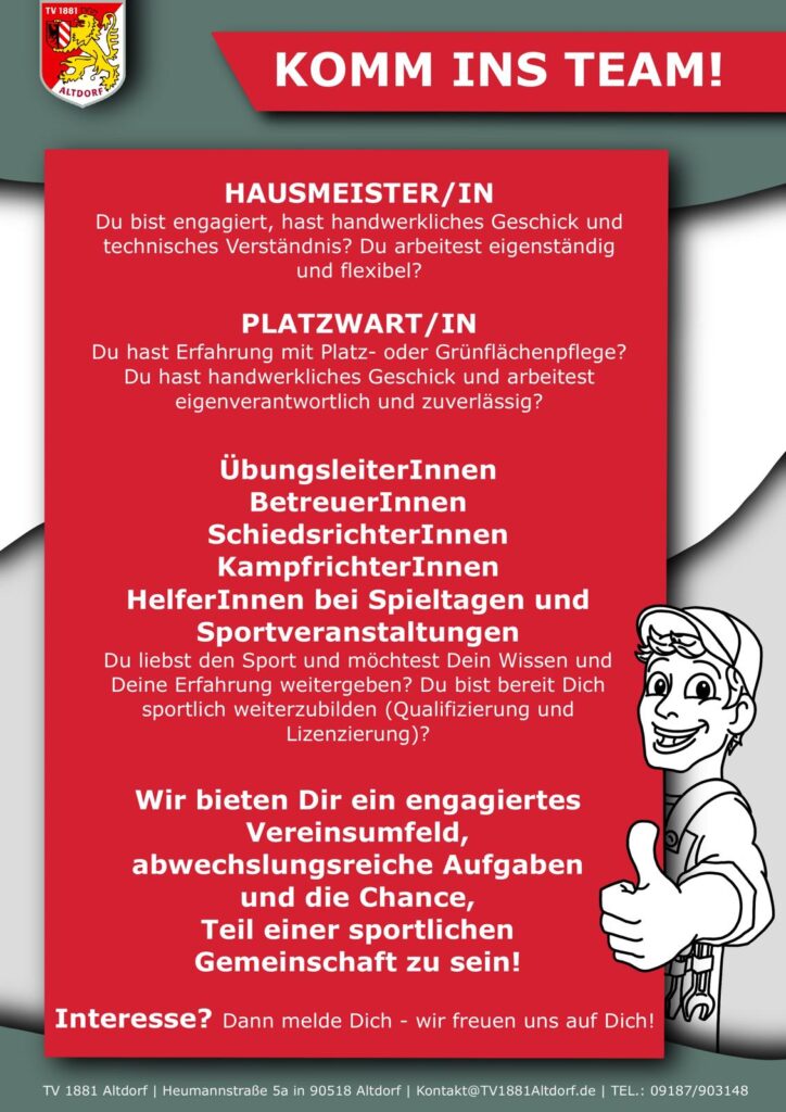 Haben wir Dein Interesse geweckt? Dann sende uns Deine vollständigen und aussagekräftigen Bewerbungsunterlagen unter Angabe eines möglichen Eintrittstermins ausschließlich per Email an: kontakt@tv1881altdorf.de